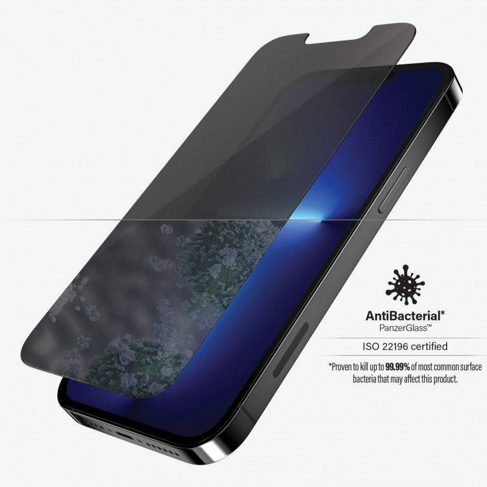 صُنع PanzerGlass ™ Standard Fit لجهاز iPhone 13  Pro Max  من الزجاج المسطح المقسّى. يتم تقليل حجم الزجاج Standard Fit ويتميز بغراء سيليكون كامل يمنح حساسية مثالية للمس مع الاستمرار في توفير قوة PanzerGlass ™ الفائقة. يجعل مرشح السرية محتوى الشاشة غير مرئي تقريبًا للجميع باستثناء مستخدم الجهاز.